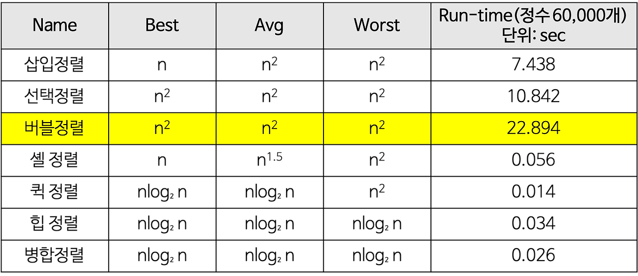 시간복잡도 : 평균, 최악- O(N^2) / 최선(모두 정렬 완료되어있을 경우) - O(N)