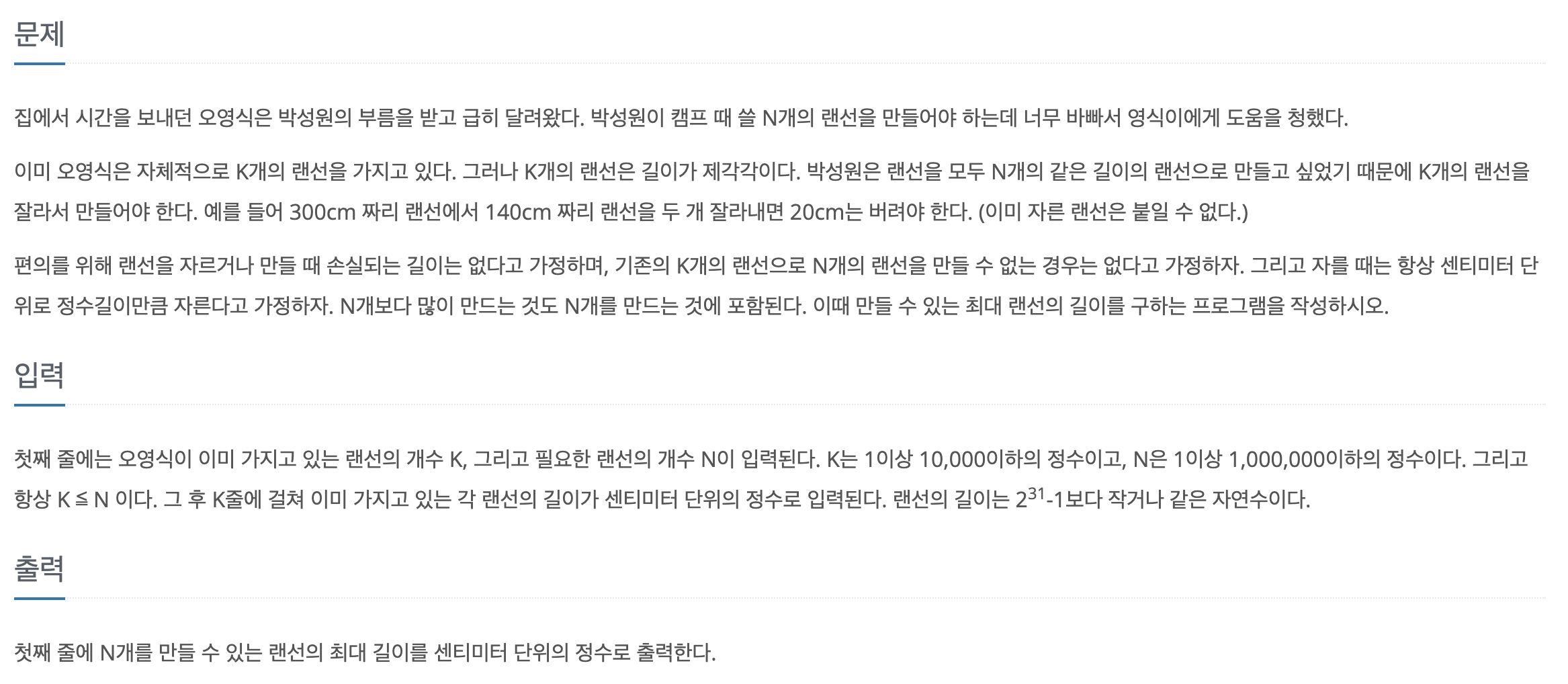 - 길이에서 최대값(max)은 주어진 랜선의 길이중 최대값+1로 설정하고 최소값(min)은 0으로 시작한다.