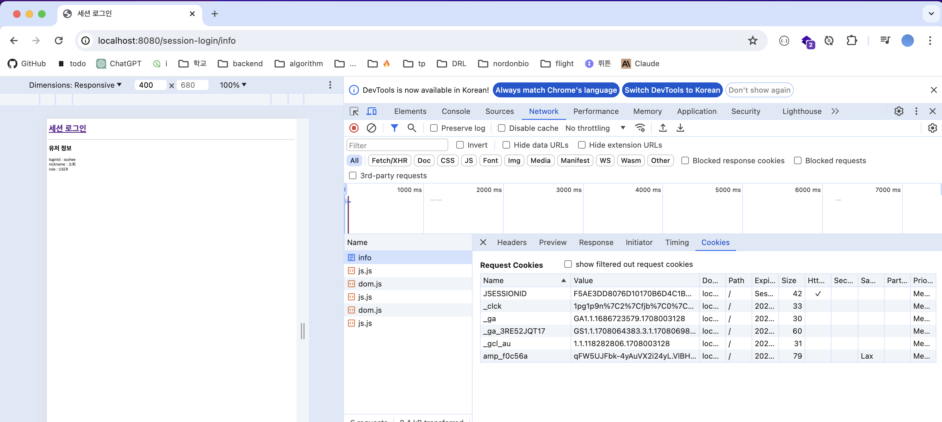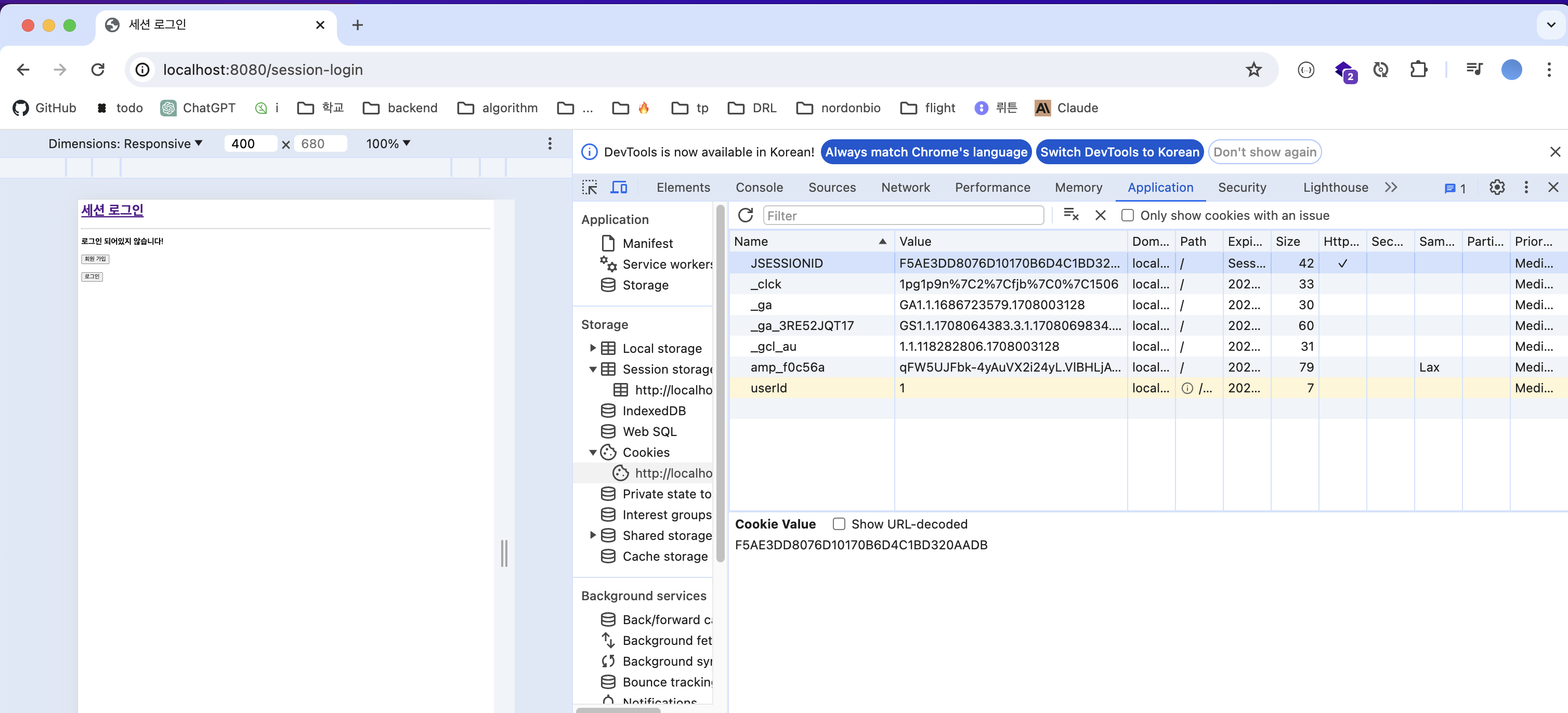 - db가 아닌 로컬 변수에 저장하기 때문에 서버 재실행 시 로그인되어 있어도 sessionList는 비어있음