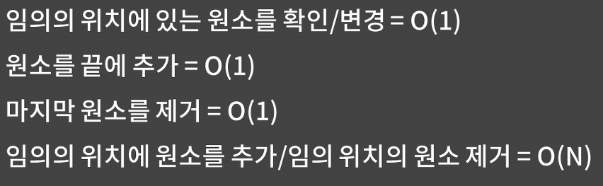 - 임의의 위치에 원소 추가, 제거 - O(N)